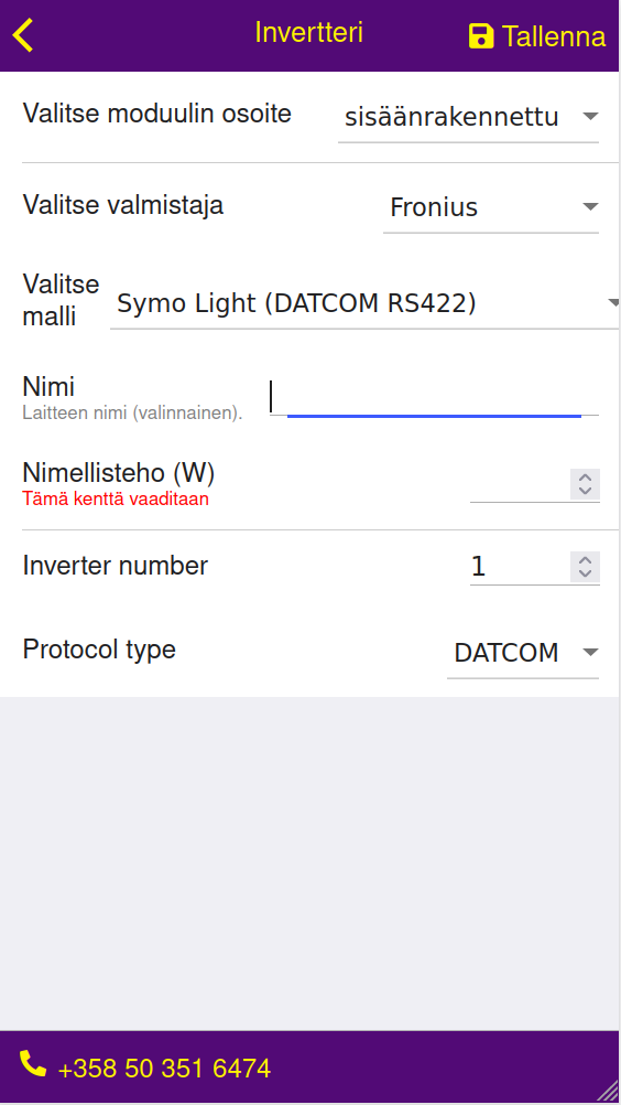 3. VALINNAINEN: Syötä invertterin nimi. Hyödyllinen, jos kohteessa on useampi, kuin yksi invertteri.