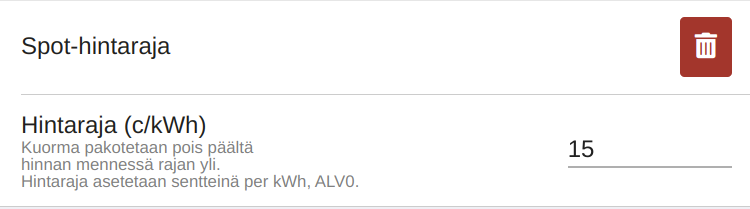 • Hintaraja: Jos sähkön spot-hinta ylittää raja-arvon (snt/kWh ALV0), lähtö kytketään pois päältä.