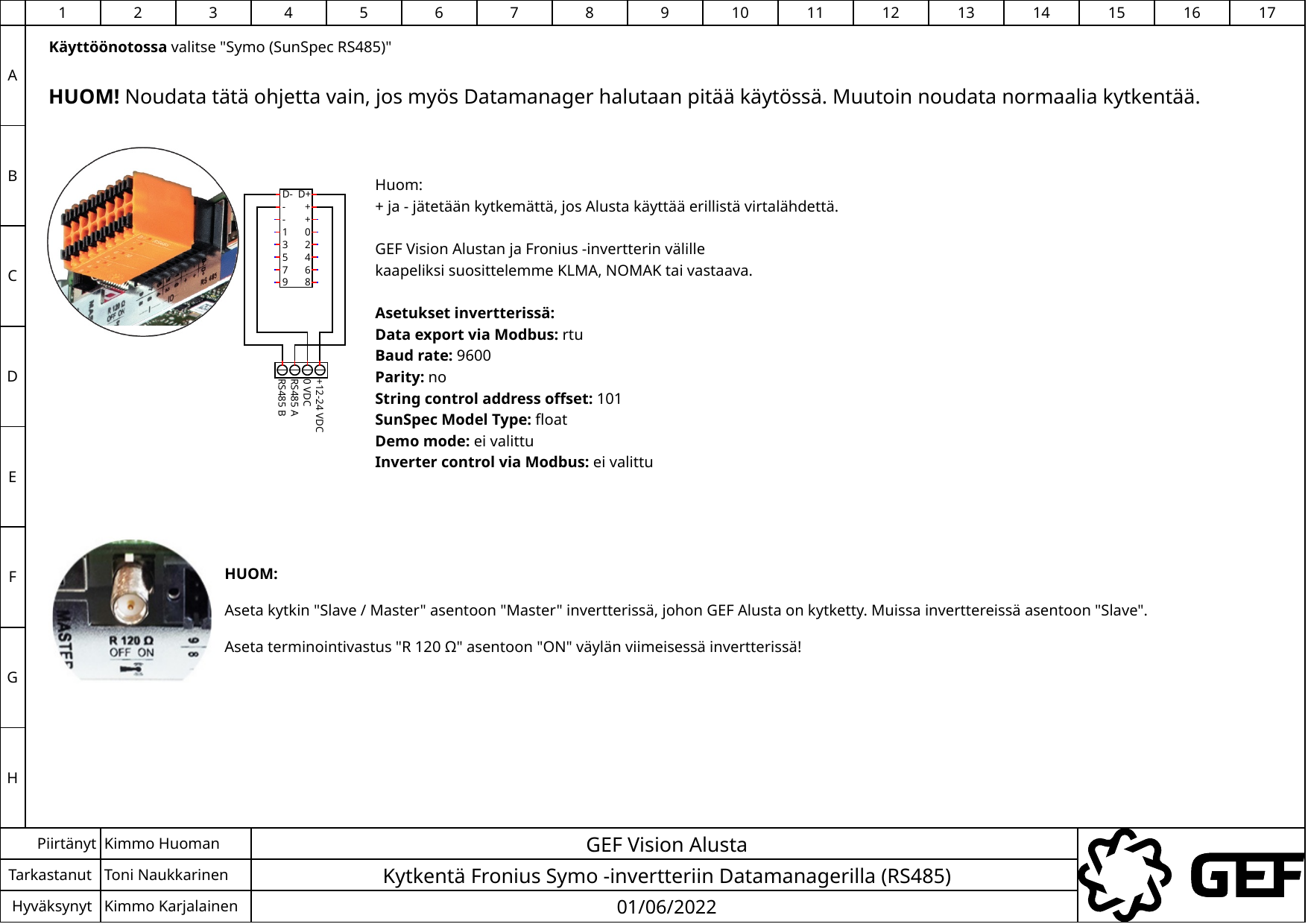 Jos ketjuun tulee useita inverttereitä, kytke ne Froniuksen ketjutusohjeen mukaisesti. Jos muissa inverttereissä on DataManager-kortti, aseta MASTER/SLAVE -valintakytkin niissä asentoon SLAVE. Invertterissä, johon Alusta on kytketty, kytkin asetetaan asentoon MASTER.